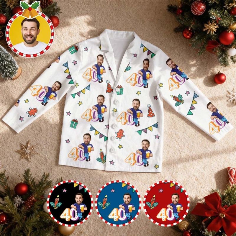 Custom Birthday Face Long Sleeve Pajamas with Beer Personalized Photo Pajamas Gift