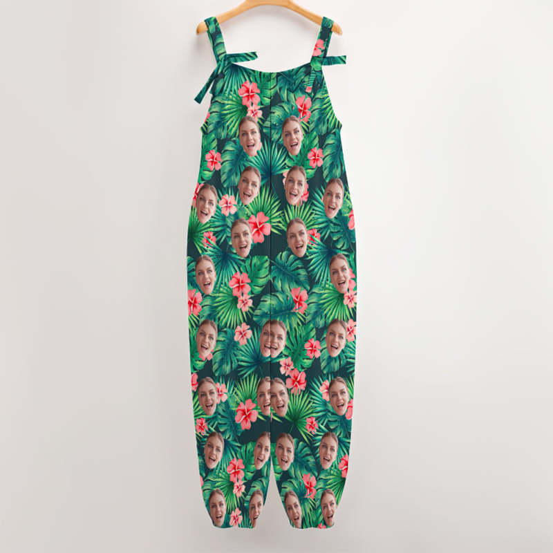 Custom Face Jumpsuit With Suspender Hawaiian Style Leaves & Flowers Rompers