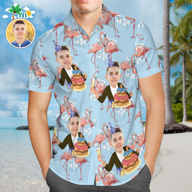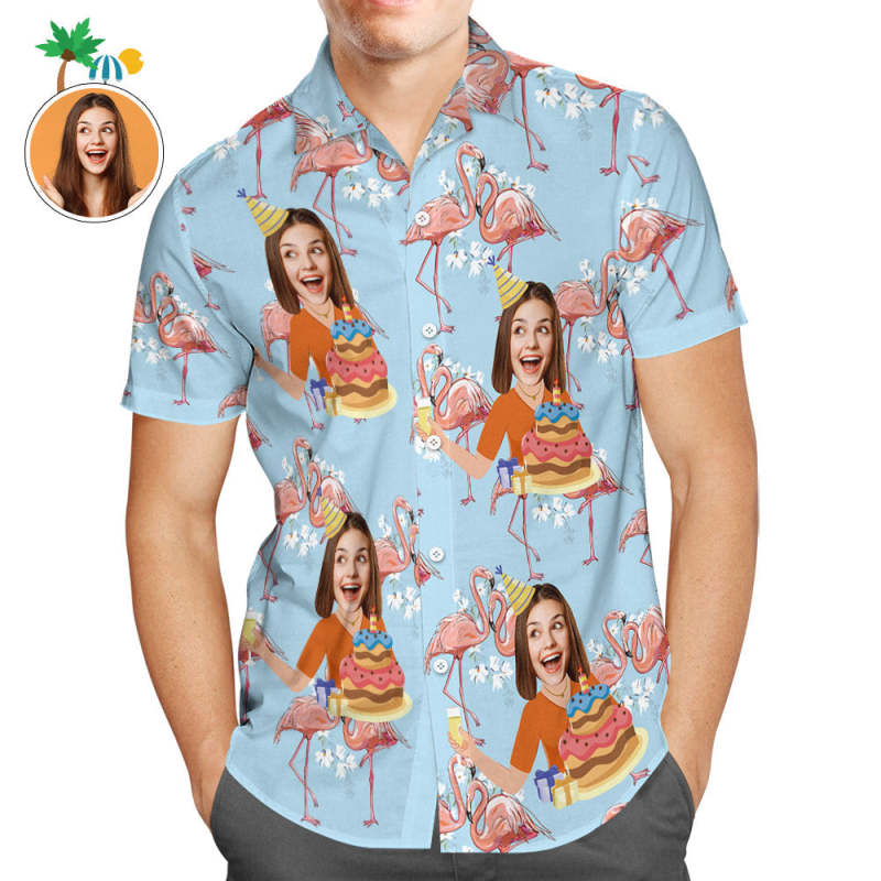Custom Face Men Flamingo Hawaiian Shirt Birthday Cake Shirt