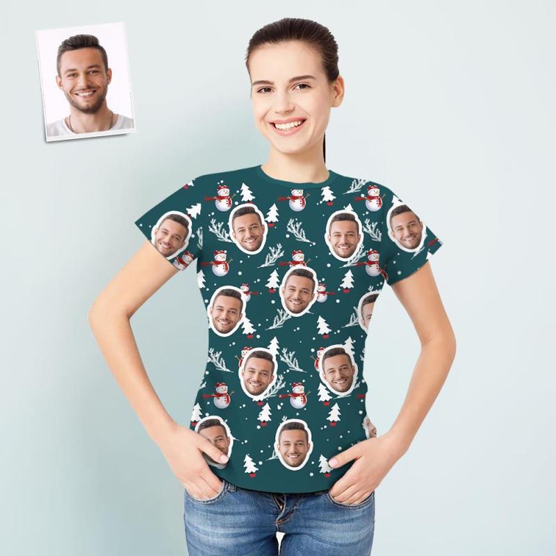 Custom Face Women's T-shirt Christmas Tree and Snowman Create Personalized Christmas Gift
