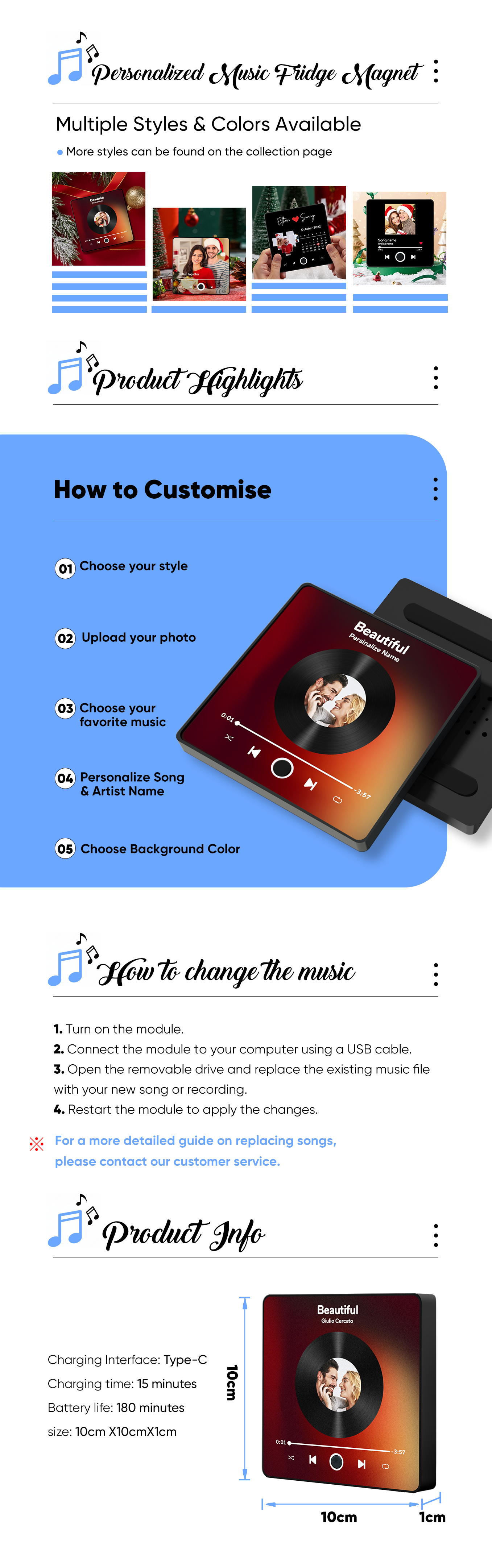 Customized Music: Choose romantic love songs or your favorite melodies for a DIY customized music fridge magnet. Each time the refrigerator magnet plays, it will be accompanied by the music of your love. If you like, you can even change the magnet's music to any song of your choice or a personal voice recording. For detailed instructions, please contact our customer service. We have a dedicated tutorial ready for you.