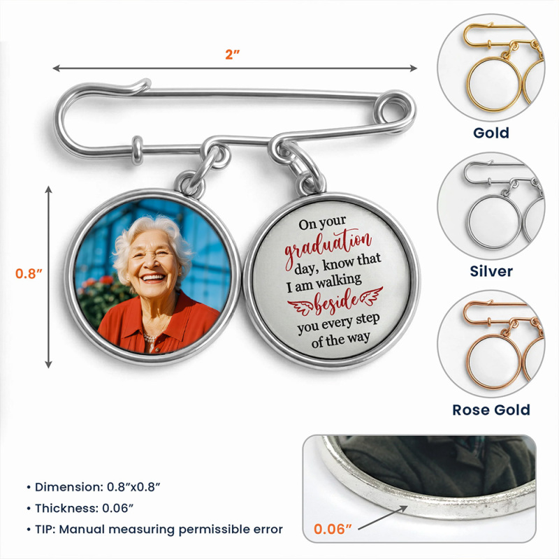 Introducing our perfect keepsake: the Graduation Walking Beside You Every Step lapel pin. It's not just an accessory; it encapsulates a tangible piece of memory. This personalized lapel pin comes with photo charms that tell a tale of unforgettable moments and shared sentiments. The lapel pin makes a beautiful memento to own, cherishing the day of proud achievement during graduation. The product captures the sense of togetherness, a constant reminder that the graduate is never alone in their journey.