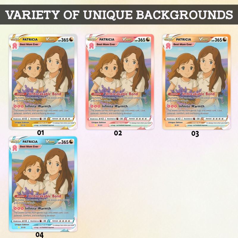 Each card is designed in anime-inspired style, featuring your custom photo, name, and text, printed on high-quality holographic material that shines beautifully in the light.
