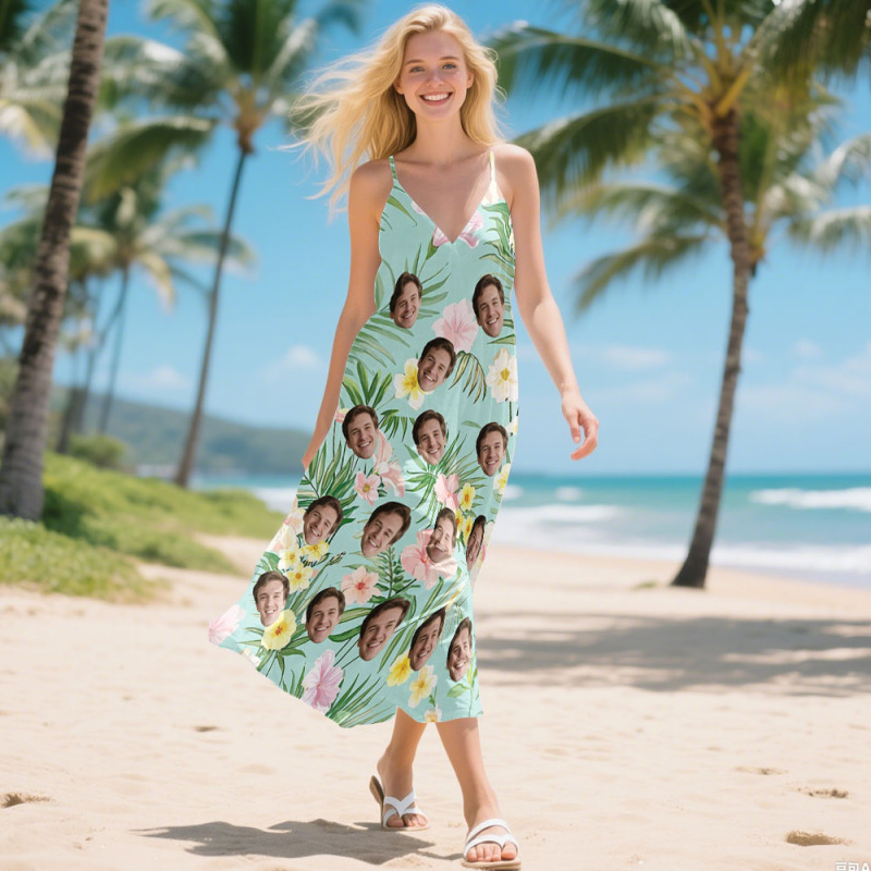 Personalized Flamingo Face Sling Long Dress Custom Face Photo Dress for Women Fun Summer Vacation Gift